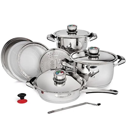 Trải nghiệm dụng cụ nấu nướng tốt nhất trên thế giới, với bộ dụng cụ nấu chống dính này, bạn đang đầu tư vào lợi ích lâu dài để có được những bữa ăn lành mạnh, đầy hương vị và tiết kiệm chi phí cho bạn và gia đình. Bộ dụng cụ nấu ăn Nutri-Stahl này cho phép bạn theo dõi nhiệt độ lý tưởng bên trong thiết bị. Bằng cách nấu ở nhiệt độ thích hợp bằng hệ thống không dùng nước, bạn sẽ giữ được nhiều vitamin, khoáng chất, chất dinh dưỡng và hương vị trong rau củ của mình hơn!